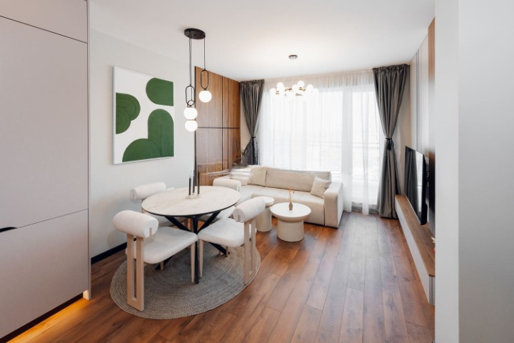 Всекидневна стилно обзаведена с удобен ъглов диван, ТВ модул с телевизор, трапезна маса и четири елегантни стола.