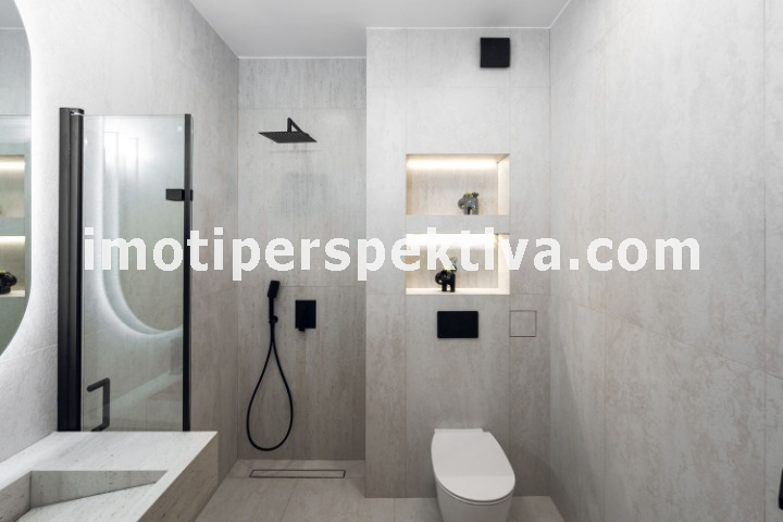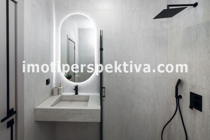 Баня завършена с висок клас плочки и оборудвана с вградена структура, модерна душ система, бойлер, мивка по поръчка и стилно огледало с LED осветление.