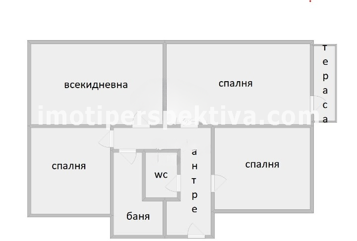 РАЗПРЕДЕЛЕНИЕ: Входно антре, три самостоятелни спални, кухня с хол, баня с перално помещение, отделна тоалетна и тераса.