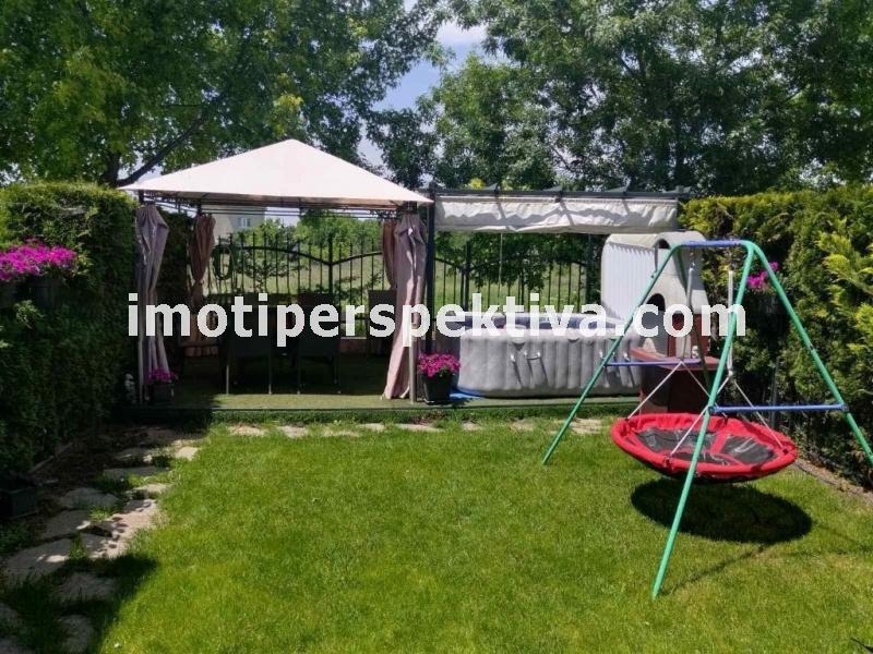 Предлагаме Ви двуетажна къща на ТИХО и СПОКОЙНО място за живеене с АКТ 16! На първото ниво се състои от СВЕТЪЛ и ПРОСТОРЕН хол с кухненски бокс, трапезария, тоалетна, мокро помещение и топла връзка с гаража. На второто ниво се състои от ТРИ спални, ДВЕ бани с тоалетна, гардеробна и офис. Към таванската част има стълбище и може да бъде обзаведено и да се ползва за живеене.Дворът е с барбекю зона, джакузи и шатра. Къщата е с подово отопление и конвектори във всяка стая. Кухнята е оборудвана с висок клас електроуреди. В хола има камина на био етанол.