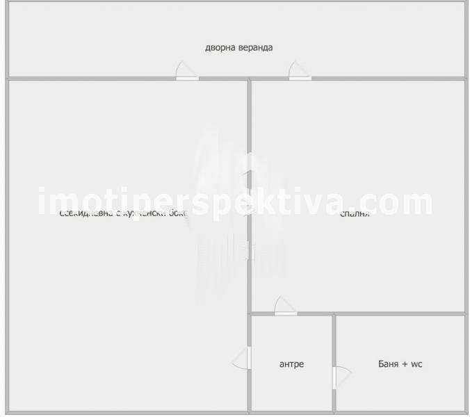 - РАЗПРЕДЕЛЕНИЕ: Състои се от голяма всекидневна с кухненски бокс, спалня, антре, баня с тоалетна и дворна веранда.