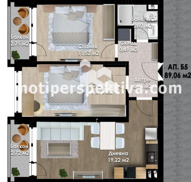 - ПЛОЩ: Жилището е с обща площ от 89,06 кв.м.