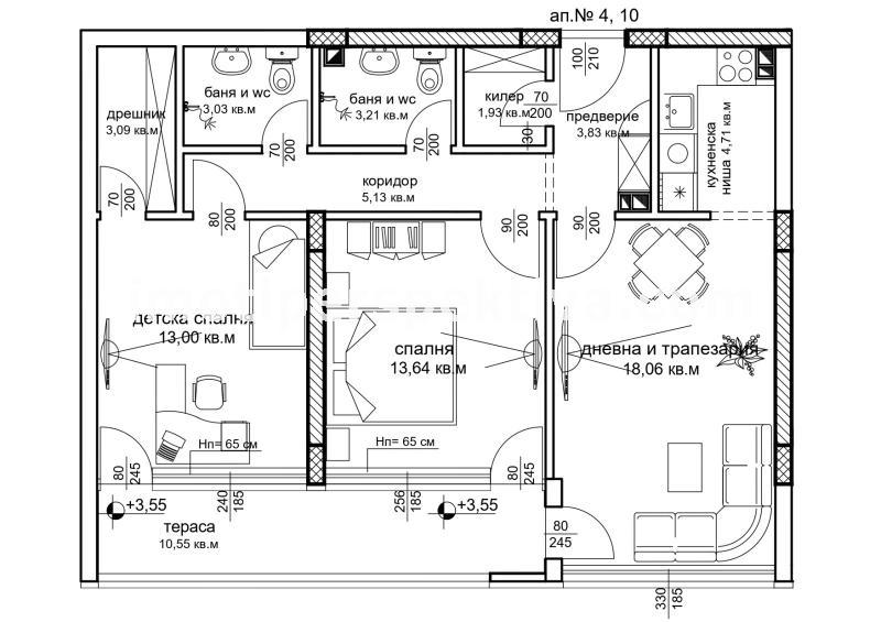 Жилището се състои от две самостоятелни спални, едната с гардеробно, дневна с кухненски бокс, тераса към всички стаи, баня с тоалетна, втора баня с тоалетна, складово помещение.
