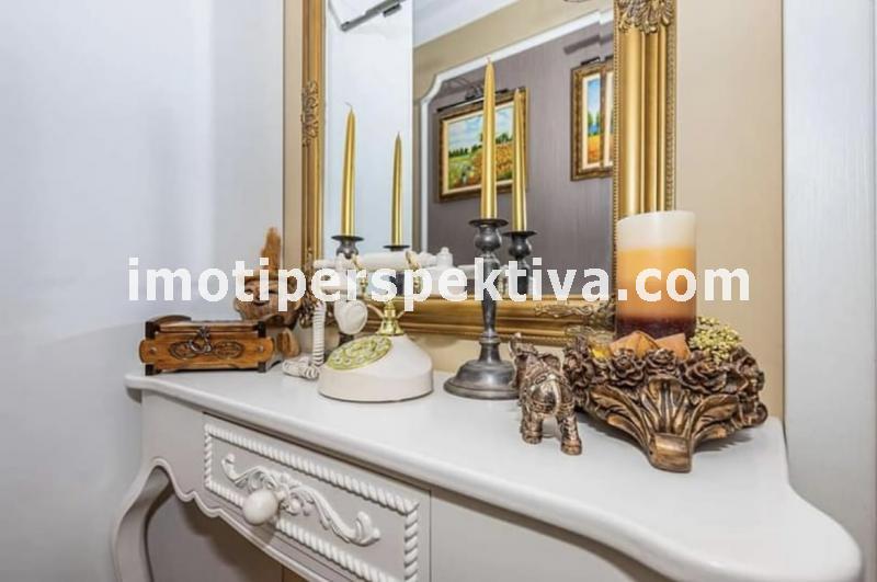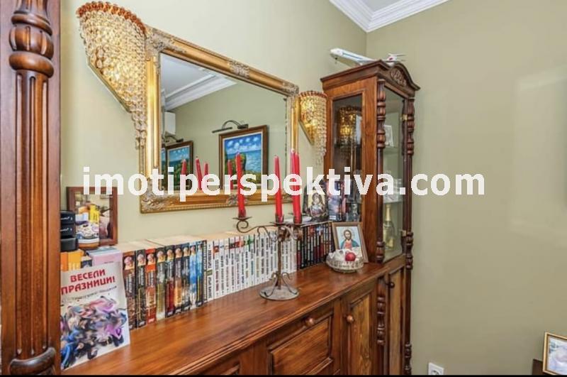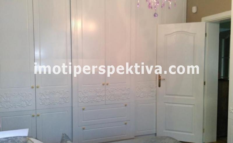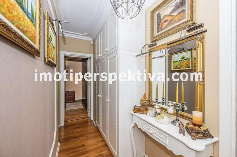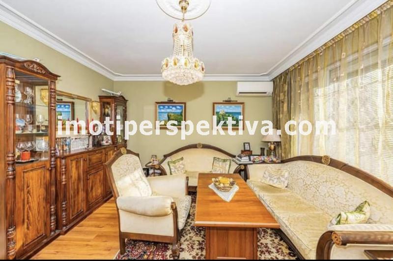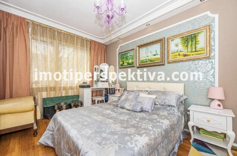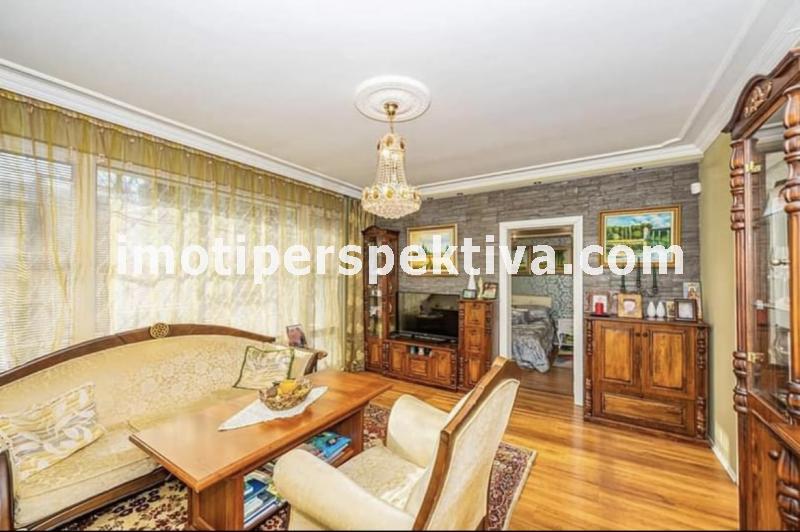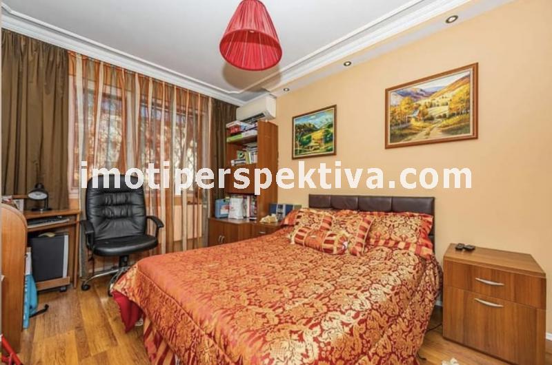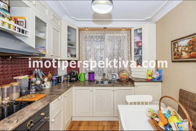 две големи, светли спални (едната преходна), голям хол, голяма кухня, тоалтна, отделна баня, две изби. Апартамента е на етаж 1 в 4 етажен малък блок, по 2 апартамента на етаж, заключващ се и чист вход. Сградата е от малкото такива в Пловдив строена по немска технология с немски вид панелни плоскости - дебели стени. Саниран, изток - запад ориентиран (лятото е сянка тъй като има дървета и от двете страни, от източната част има междублоков парк), напълно обзаведен (всичко остава без лични вещи) - два климатика - Дайкин професионална серия, телевизор - 42 инча в хола, пералня, печка - всички уреди остават. Пълен основен ремонт преди няколко години, направен с изключително качествени материали. Мебелите са по поръчка за апартамента - качествено направени. СОТ Алфа (20 лева на месец пр желание от новия собственик да го задържи). Поради добрата изолация и разположение на сградата - сметки зима за отопление и вода (ТЕЦ) около 150 лева на месец, лятото климатици около 50 лева. Жилище, което си залужава да се види, правено с вкус към детайла. Продава се на чатни лица. За купувачи, които търсят жилище, в което да се нанесат веднага без никакви допълнителни разходи.