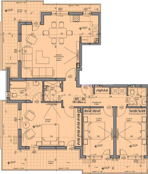 -Апартаментът се състои от всекидневна с кухня и трапезария , ТРИ спални (едната от които 22 кв.м.) ,две бани с тоалетни , склад , два килера , две големи тераси с панорамен изглед .