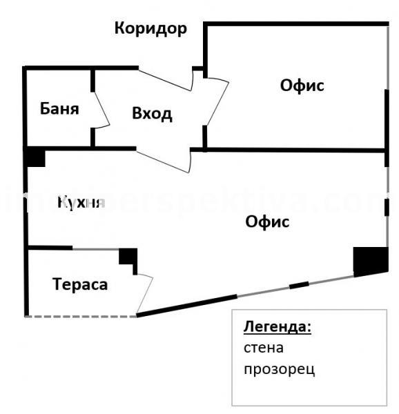 Имотът се намира на 1-ви етаж на пететажна сграда с отделен вход и коридор, споделян само с още един офис.